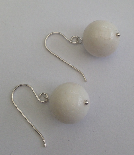 (1631)Wit ponskoraal oorbellen (1631) Aantal: € 13,00 Oorhaken van 925 zilver met een witte bol sponskoraal (14mm). Totale lengte oorbel is 29mm. Geischt per oorhaak 4g.