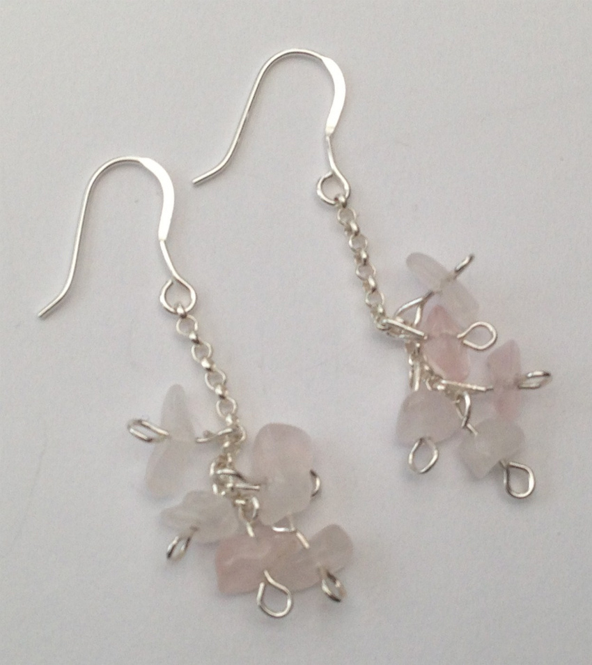 (1314)Rozenkwarts chips oorbellen (1314) Aantal: € 12,00 Oorbellen van rozenkwarts chips met zilver ketting.