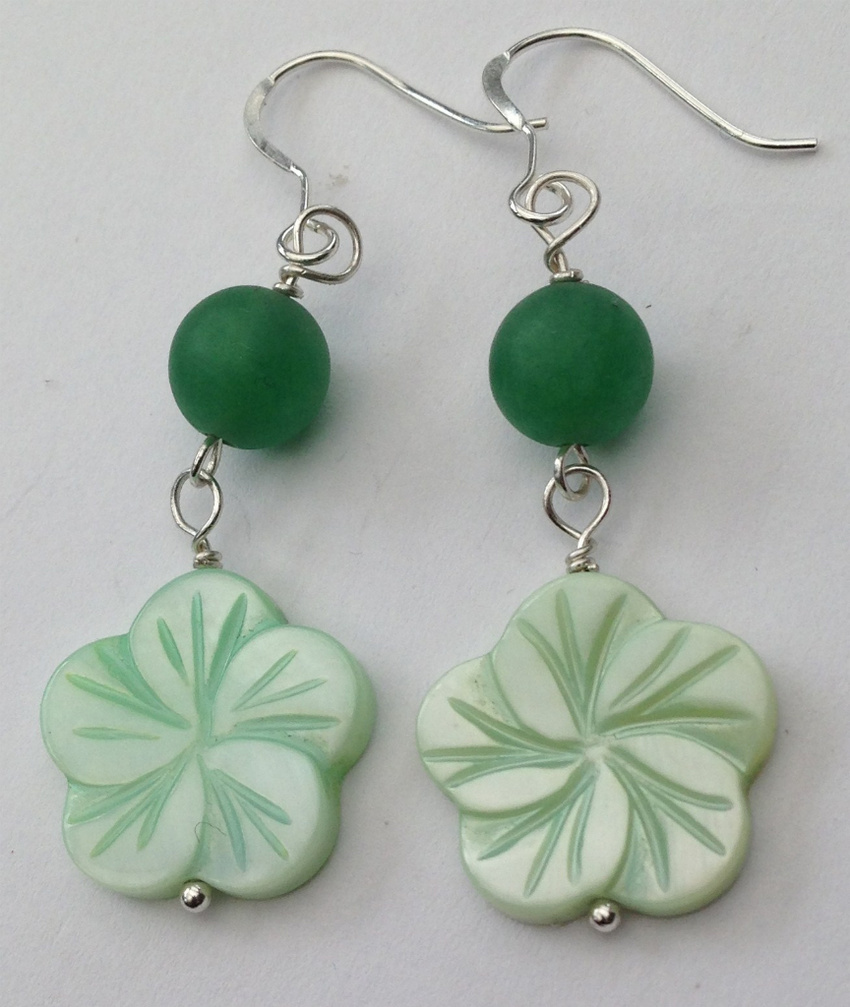 (1309)Groene schelp en jade oorbellen (1309) Aantal: € 12,00 Oorbellen van pastel groene bloem schelp met jade bolletje, afgewerkt met zilver.